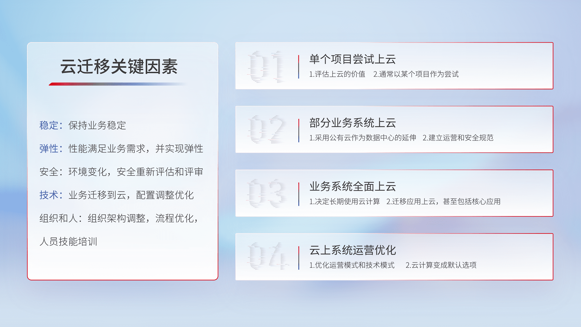 结合实际业务,,,,从规划设计、、、、云平台选型、、、云原生改造、、、、数据迁移、、集成交付,,,,迁移全过程为客户识别最佳上云路径,,做好风险识别管理,,,,设计网络架构、、、身份权限、、安全审计合规、、、操作审计、、、日志审计、、监控告警策略、、多站点容灾设计等,,对云上基础设施进行整体规划,,,提升IT治理水平,,以满足弹性、、高可用、、、、高性能的需求。。。