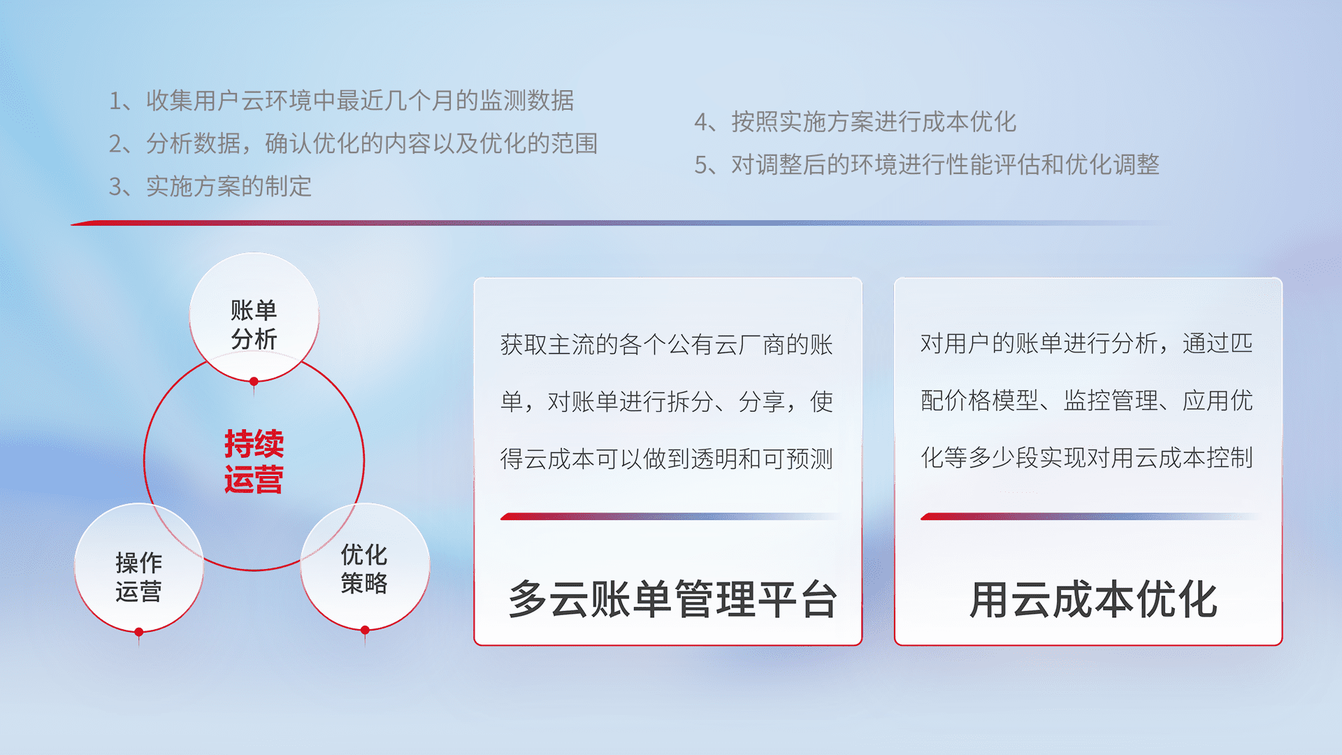 通过多云纳管,,,,以统一的资源数据模型把客户的云资源进行抽象和封装,,进而实现对多云资源的统一操作,,,保障云资源管理的可靠性、、、、稳定性与可用性。。。。量身定制化运维内容,,,配置、、、开发运维、、补丁管理、、、、备份、、、监控、、认证和访问管理、、、审计和日常巡检等,,,保障在用云过程中的可靠度,,,稳定度以及高可用率。。